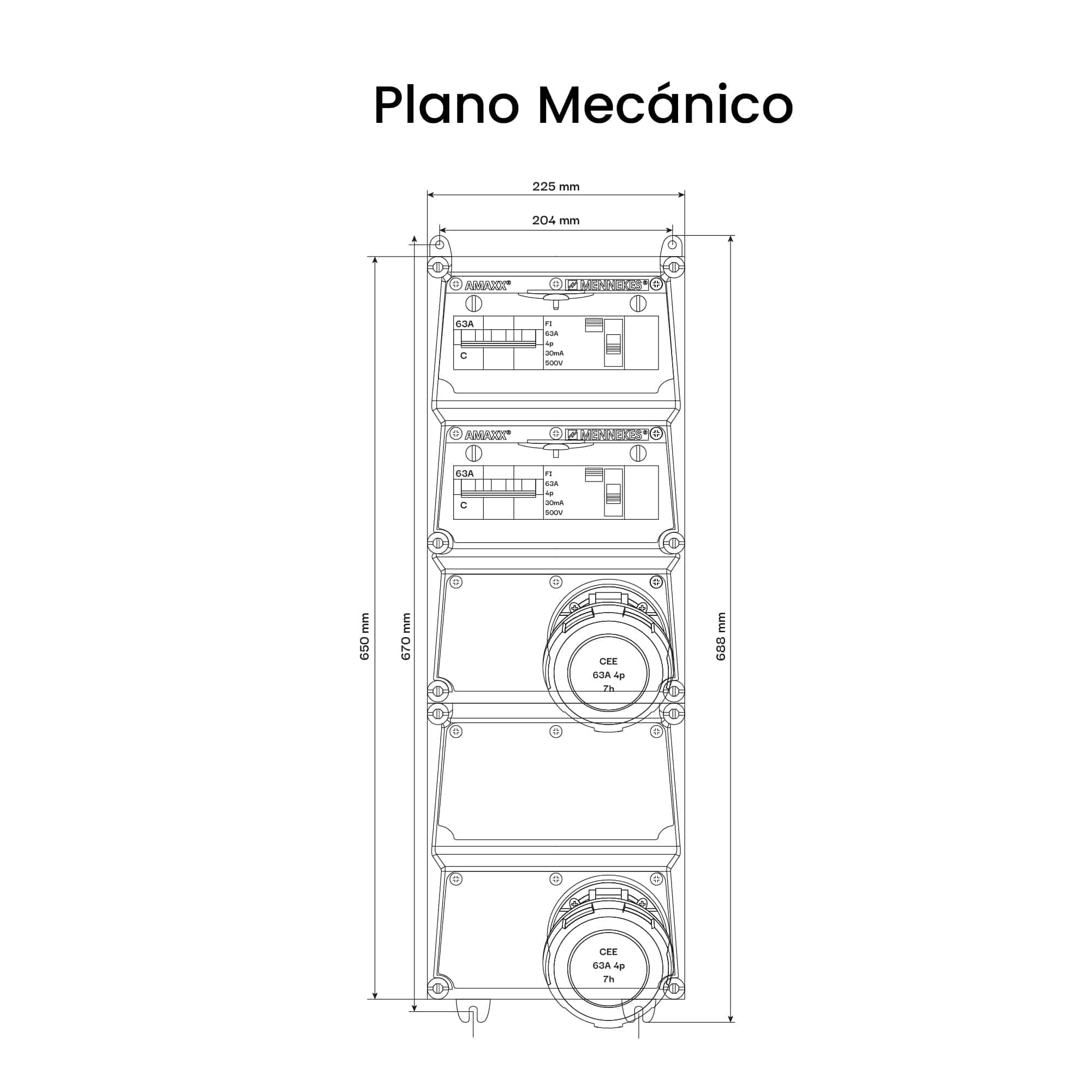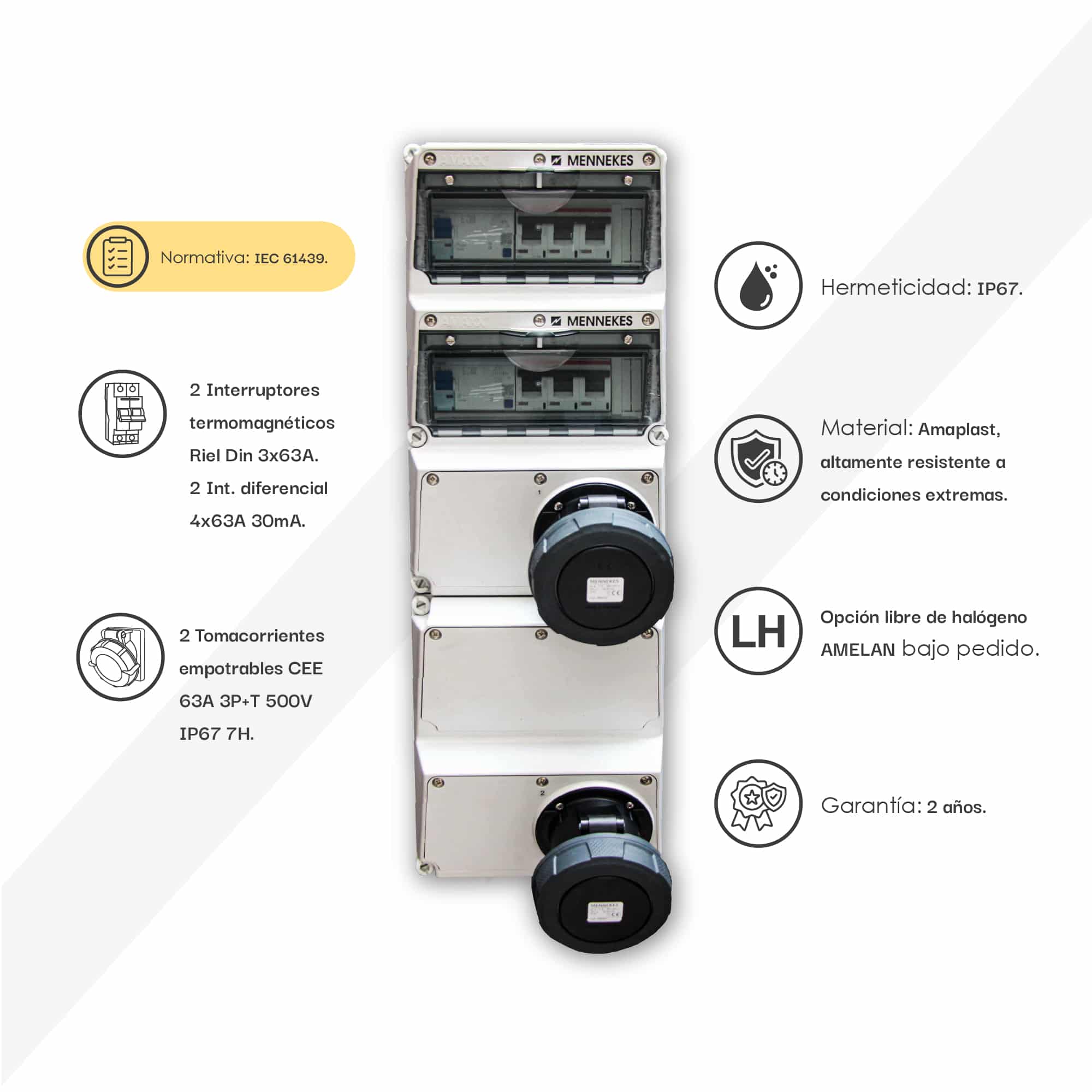 CAJA COMBINADA AMAXX IP67 2 TOMAS 63A 3P+T 500V 7H C/ 2 INTERRUPT.TERMO 3X63A + 2 INTERRUPT.DIFERENCIAL 4x63A