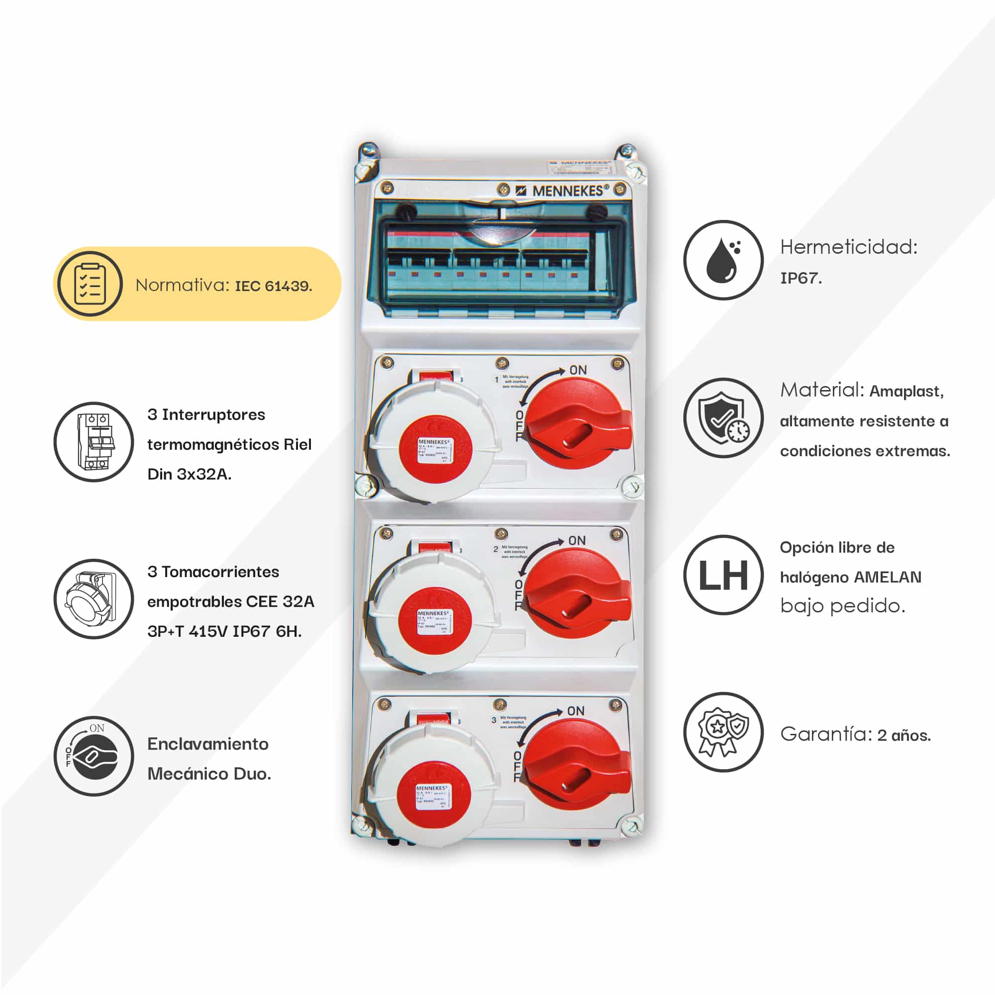Caja Amaxx IP67 con 3 tomas 32A 3P+T, bloqueo DUO y protección 3x32A.