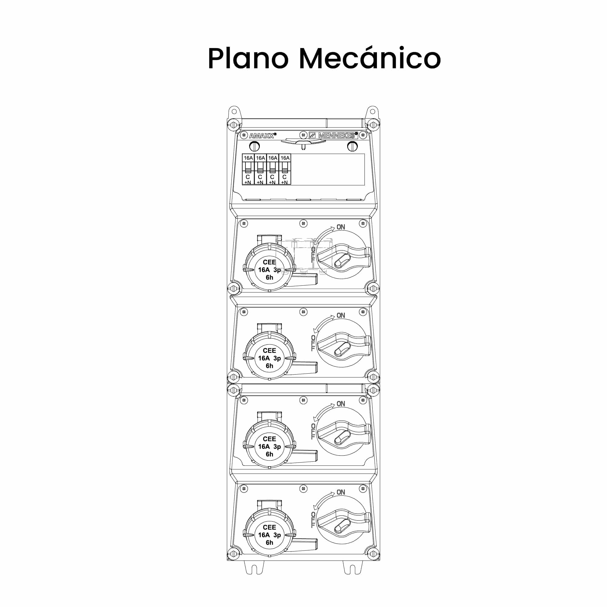 Caja combinada Amaxx IP67 con 4 tomas 16A 2P+T (250V). Incluye bloqueo mecánico DUO y 4 interruptores termomagnéticos 2x16A, facilitando alimentación con enclavamiento y protección en uso profesional.