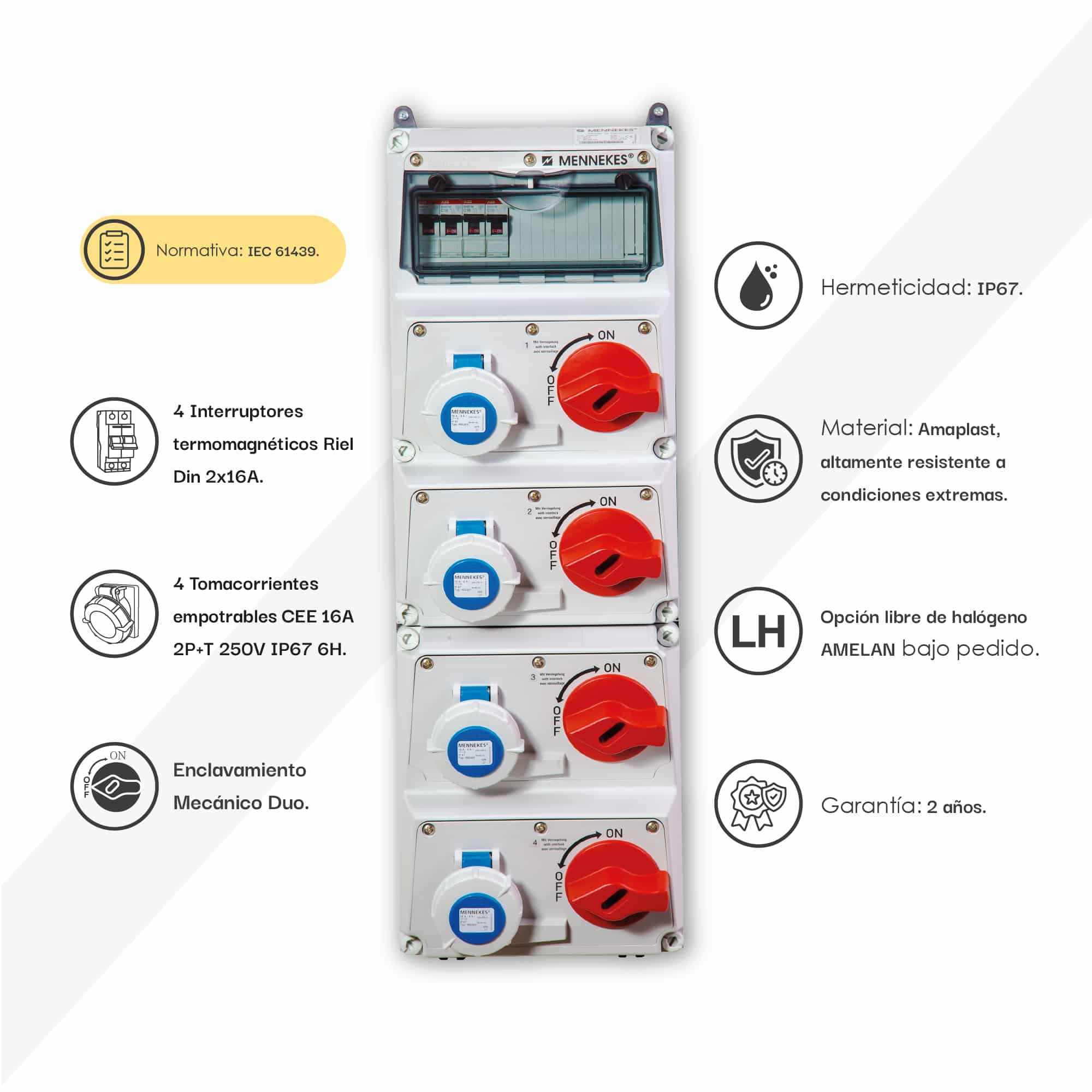 CAJA COMBINADA AMAXX IP67 4 TOMAS 16A 2P+T 250V C/BLOQUEO MEC. DUO C/ 4 INTERRUP.TERMO 2X16A