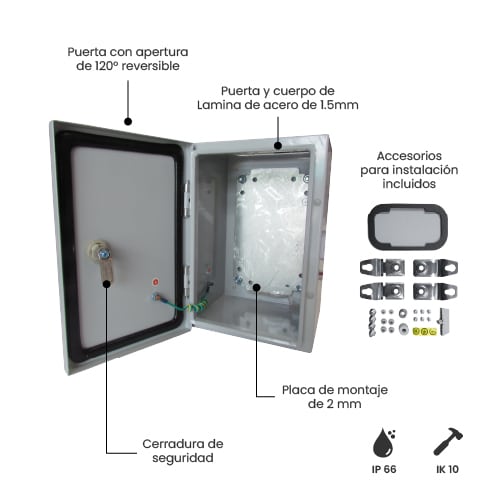 Tablero metálico adosable de alta resistencia con protección IP66 que resguarda equipos eléctricos del polvo y la humedad. Fabricado con acero durable, es ideal para proyectos donde se requiere una instalación segura y de alto rendimiento.